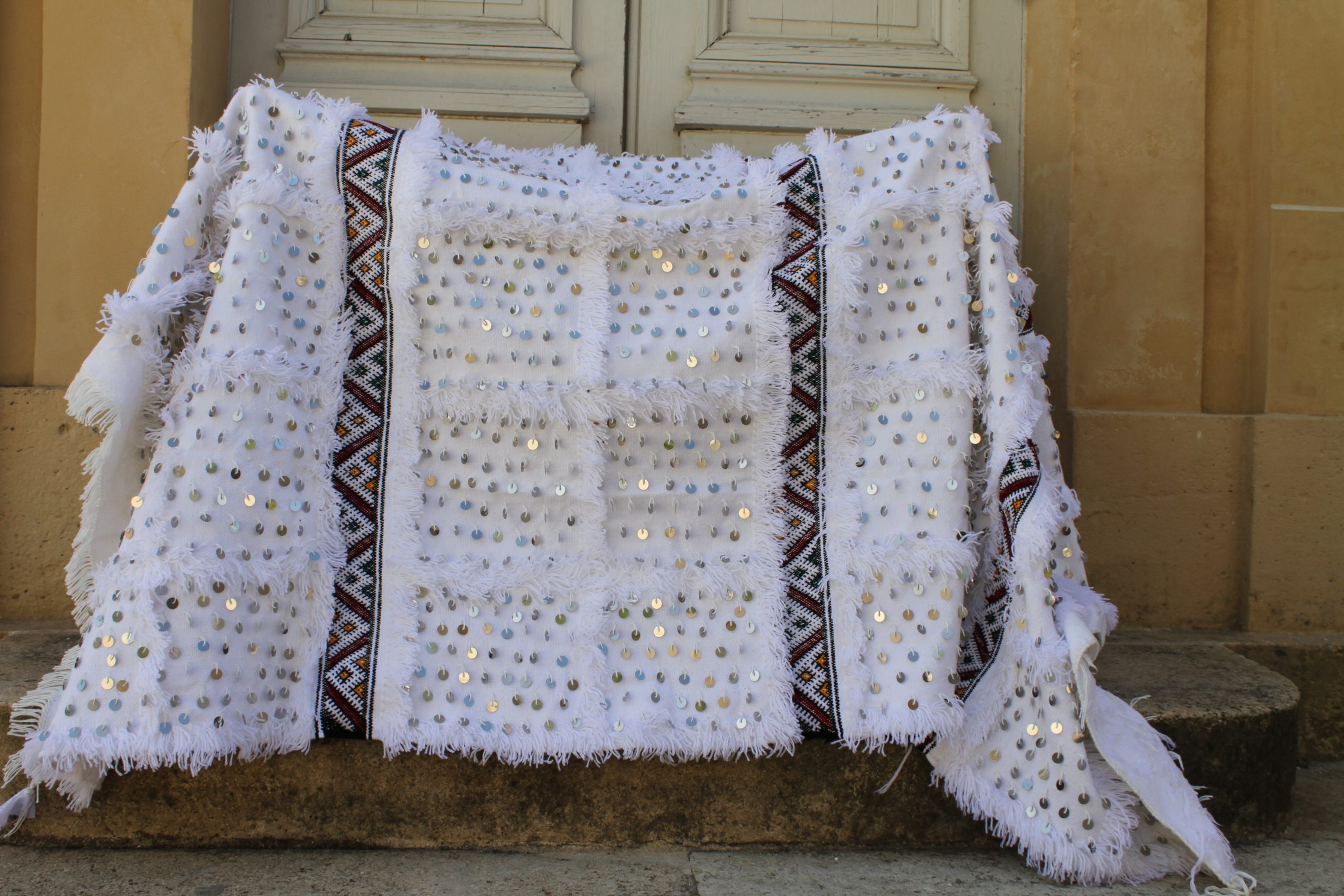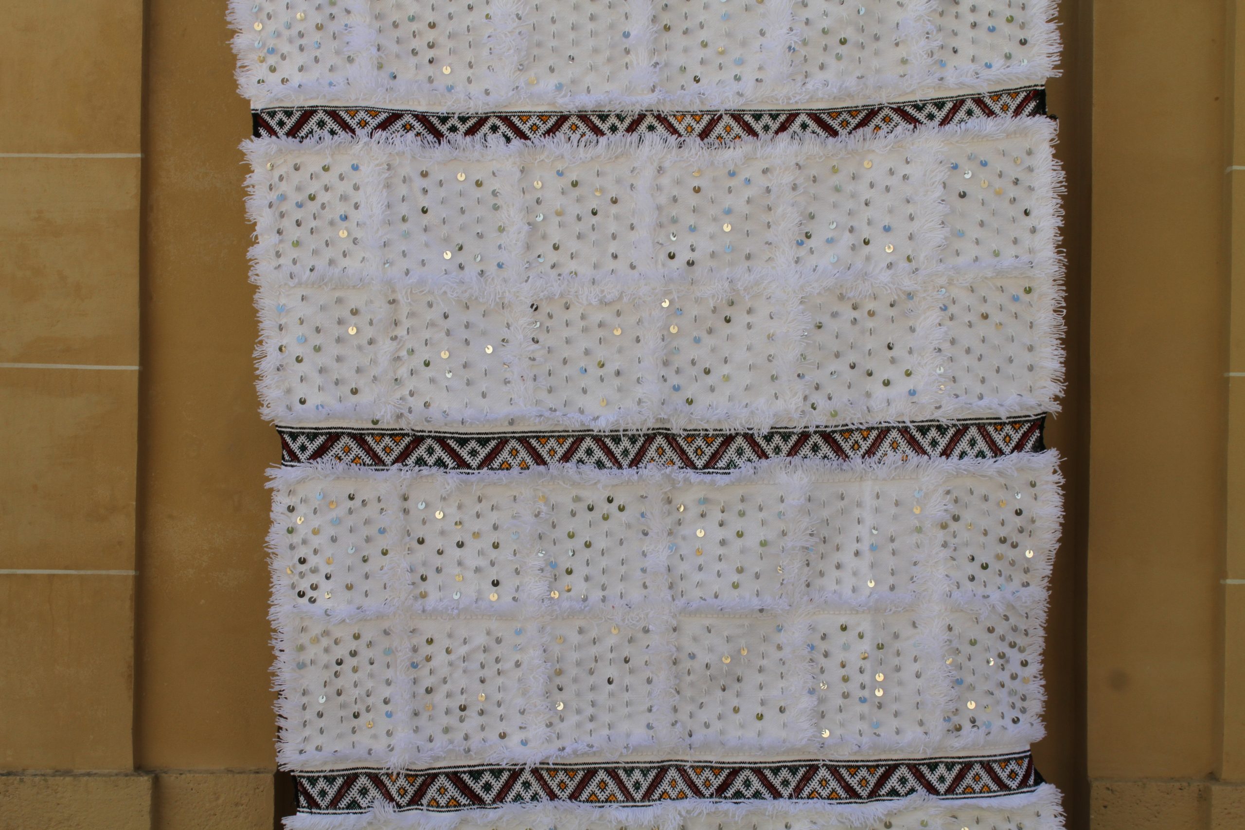 Handira blanche parsemée de sequins argents et chevrons berbères colorés