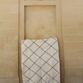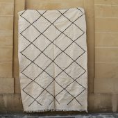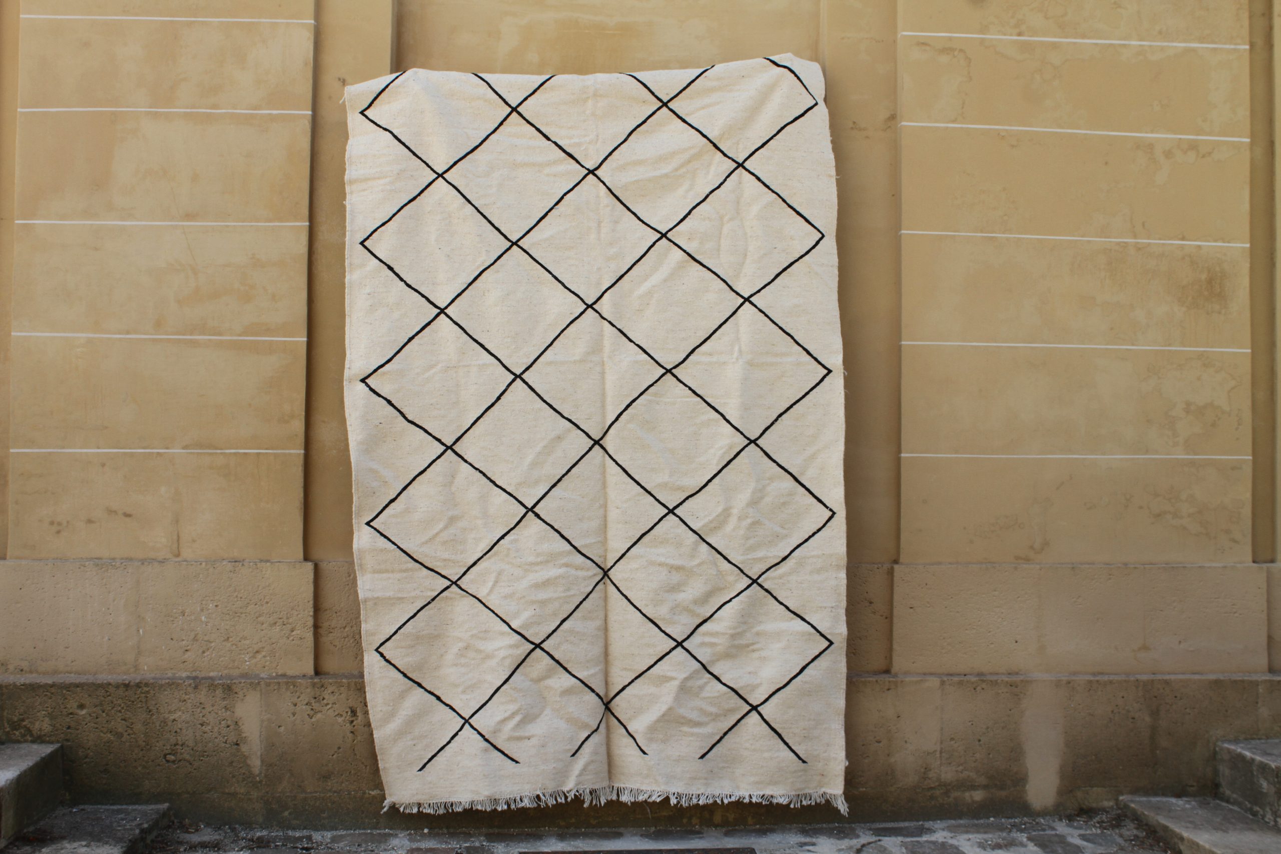 Tapis Kilim fin et rigide crème et losanges noirs qui rappelle le Beni Ouarin avec ce motif.
