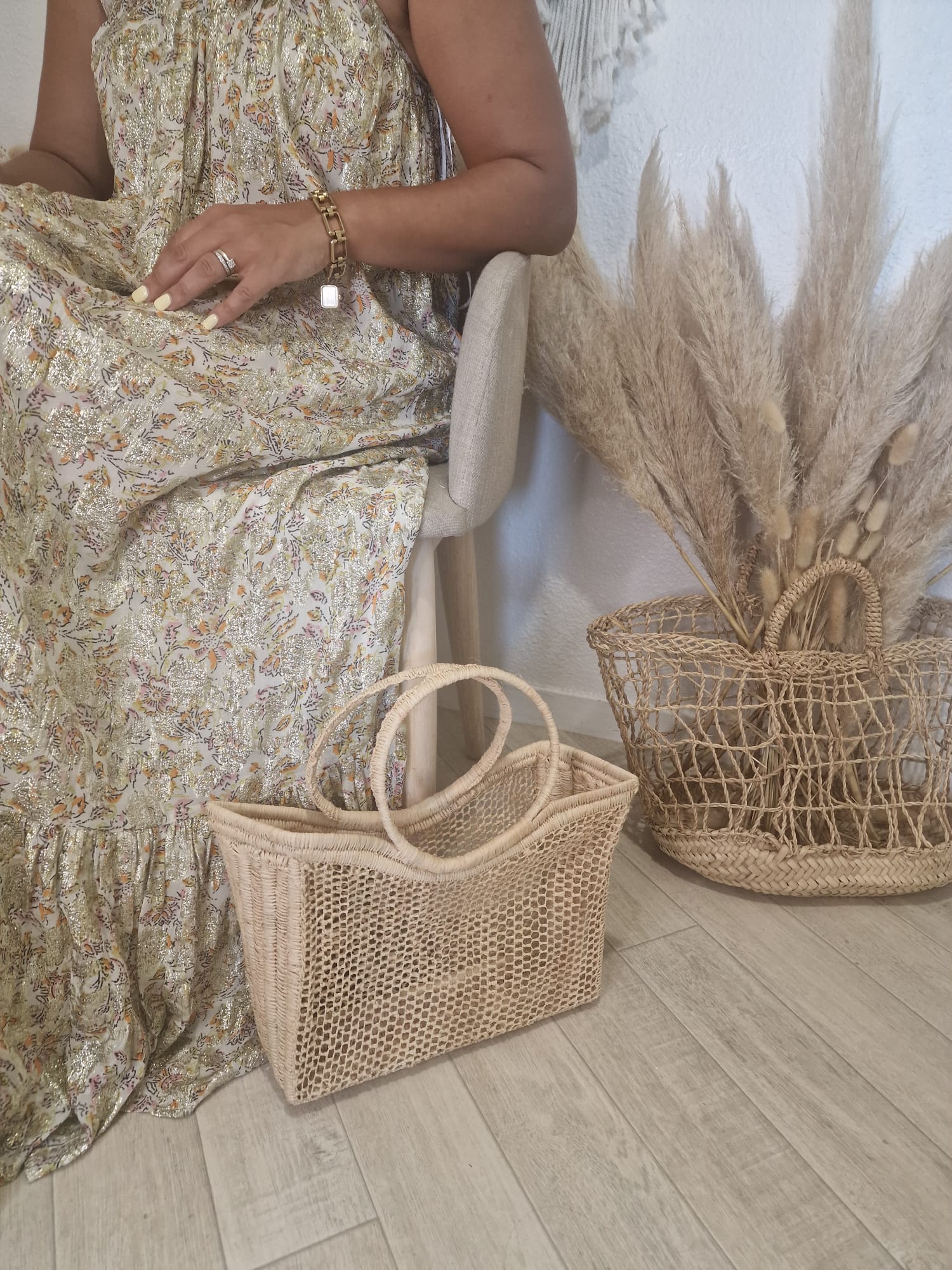Explorez le sac à main Nour de l’artisanat marocain, conçu avec une dentelle raffinée en raphia. Son design unique en “nid d’abeille” incarne le style chic, bohème et décontracté. Les poignées rondes ajoutent une touche sophistiquée, reflétant le savoir-faire artisanal traditionnel du Maroc. Chaque pièce est fabriquée avec soin.
